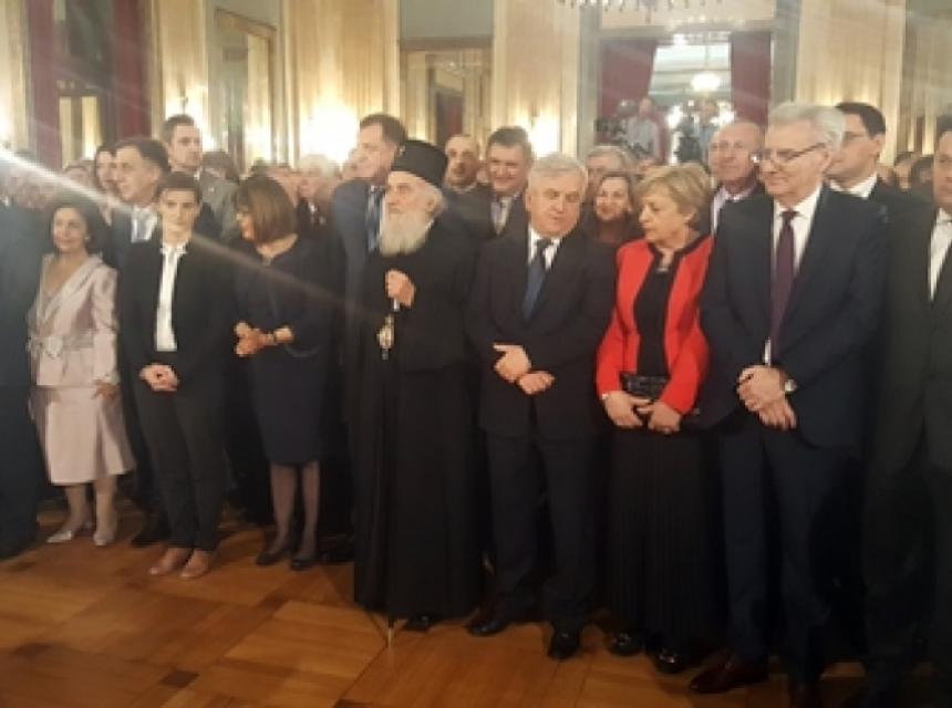 Svečanom prijemu su prisustvovali predsjednik Republike Srpske Milorad Dodik, premijerka Srbije Ana Brnabić, Njegova svetost patrijarh srpski Irinej, potpredsjednik Narodne skupštine Republike Srpske Nenad Stevandić, predsjednik Akademije nauka i umjetnosti Republike Srpske Rajko Kuzmanović, generalni sekretar Narodne skupštine Republike Srpske Marko Aćić, ministri u vladama Republike Srpske i Srbije, brojne zvanice i gosti.