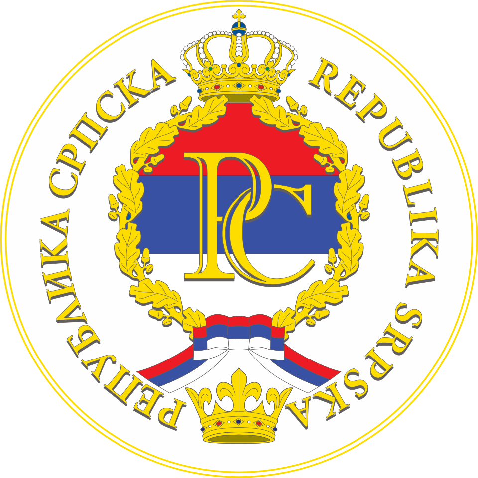 The Emblem of the Republic of Srpska is composed of a field in colors of the Republic of Srpska flag, across which lies a golden intertwined initial of the Republic of Srpska; the field is surrounded by a golden fertile oak wreath at the bottom, tied up with a ribbon in colors of the flag; above the field lies a golden closed heraldic crown, and below the field lies a golden fleur de lys crown; around all is a circumscription REPUBLIC OF SRPSKA (in cyrilic) – REPUBLIC OF SRPSKA (in Latin alphabet). |