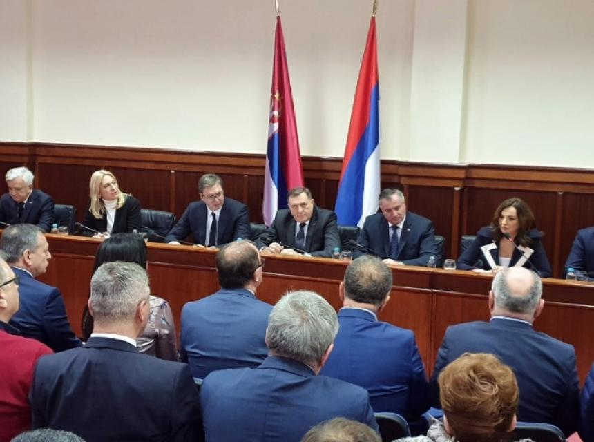 Вучић је истакао да је најважније да Србија и Република Српска заједнички раде и захвалио руководству Српске на томе што разумију колико је важно да очувају цјелину народа и увек буду заједно.