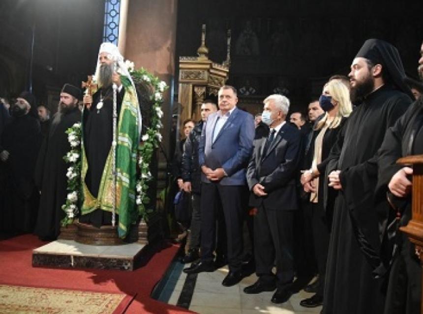 Predsjednik Narodne skupštine Republike Srpske Nedeljko Čubrilović, predsjednica Srpske Željka Cvijanović i srpski član Predsjedništava Milorad Dodik dočekali su Patrijarha Porfirija u Hramu Svete Trojice u Banjaluci.